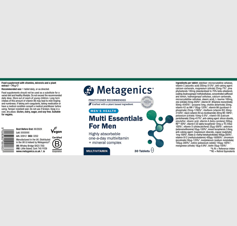 Containing 27 essential vitamins and minerals in their most absorbable forms, our high-strength multi-nutrient supplement is the ideal all in one tablet for men who lead busy and modern lifestyles. As well as providing targeted support for muscle function, energy production and immunity, Multi Essentials for Men also provides support for prostate, cardiovascular, fertility and cognitive function. Just one tablet per day is all you need for the optimum therapeutic dose.